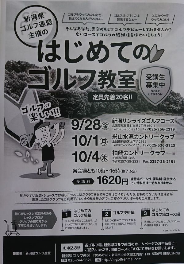 平成30年度「はじめてのゴルフ教室」の開催案内をいたします。各会場の定員が先着20名となっております。参加申込書にご記入の上、FAXにてお早目にお申込みください。なお、各会場の参加申し込み用紙は「お知らせ欄」にアップしてあります。